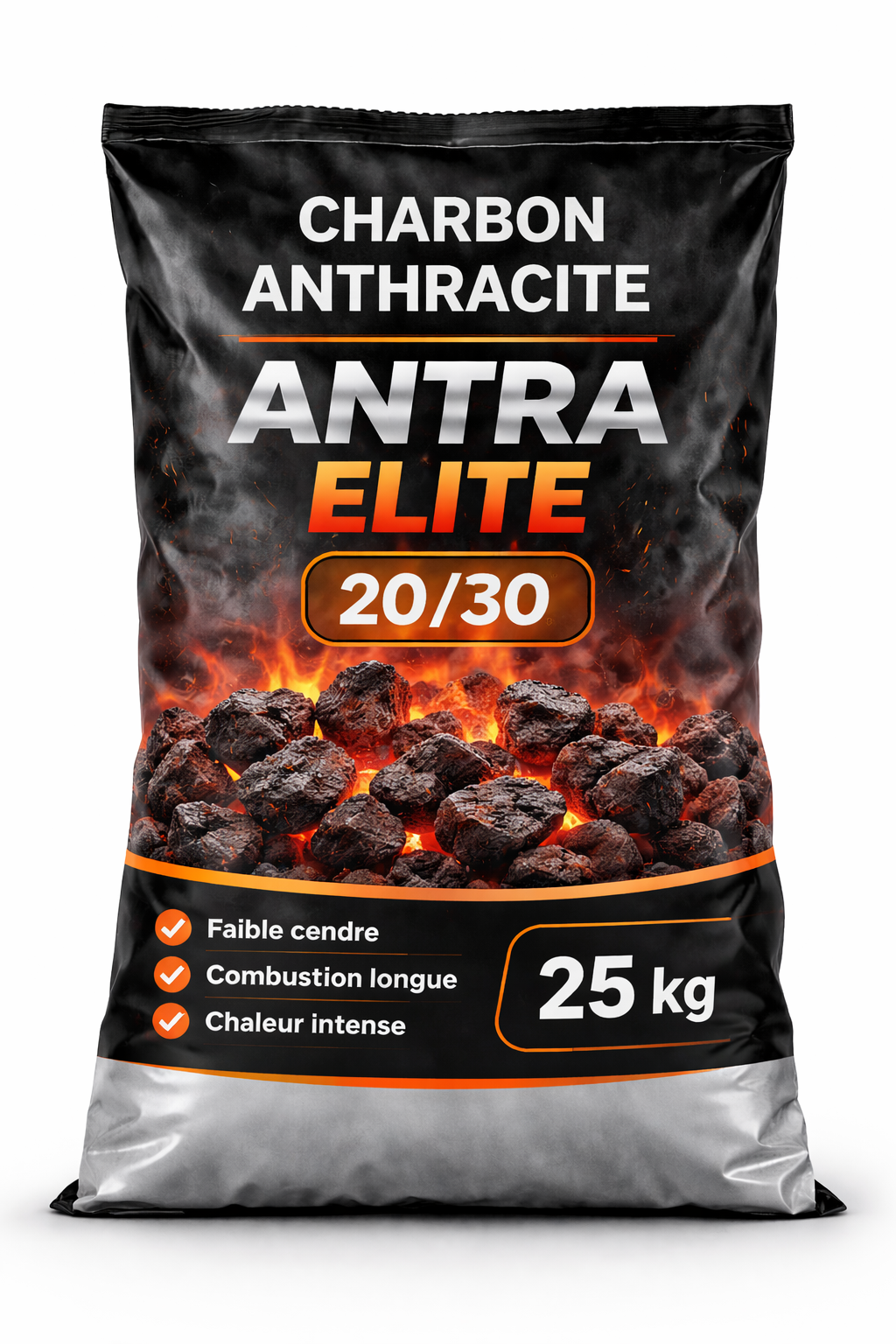 CHARBON ANTHRACITE 20/30 – ANTRA ELITE – 1T – 40 sacsPalette de charbon anthracite ANTRA ELITE 20/30, composée de 40 sacs de 25 kg (1 tonne).Combustible haut de gamme offrant une combustion longue, une chaleur intense et très peu de cendres. 907€ TTC Quantité: Ajouter au panier?? Un charbon puissant pour une chaleur durable? Meilleur rapport quantité / prix?? Chaleur intense et constante?? Combustible économique et performantLe charbon anthracite ANTRA ELITE 20/30 est idéal pour les installations nécessitant un calibre plus gros, assurant une combustion lente et régulière.?? Contenu40 sacs de 25 kgTotal : 1 tonneCalibre : 20/30 mm?? Avantages? Combustion plus lente grâce au gros calibre? Chaleur constante et durable? Très peu de cendres? Peu de fumée? Format pratique? PerformanceCombustion : très longue duréeRendement : élevéChaleur : stable?? Utilisation?? Idéal pour :poêles à charboninstallations adaptées gros calibre?? LivraisonLivraison à domicile sur palette.?? Conseil proStocker au sec pour conserver la qualité.?? TABLEAUCaractéristiqueDétailTypeAnthraciteCalibre20/30 mmConditionnement40 sacsPoids total1 tonneSac25 kgCombustionTrès longue Produits associés BOIS D’ALLUMAGE – Filet ±25 L – Bois sec prêt à l’emploiFilet de bois d’allumage sec et prêt à l’emploi, idéal pour démarrer rapidement votre feu.Contenance ±25 L.A partir de 5,3€ TTCAjouter au panier BUCHES DE BOIS – Filet ±25 L – Bois prêt à l’emploiFilet de bûches de bois de chauffage prêt à l’emploi, en format ±25 L.Idéal pour un usage occasionnel, un petit feu ou en dépannage.A partir de 7,5€ TTCAjouter au panier